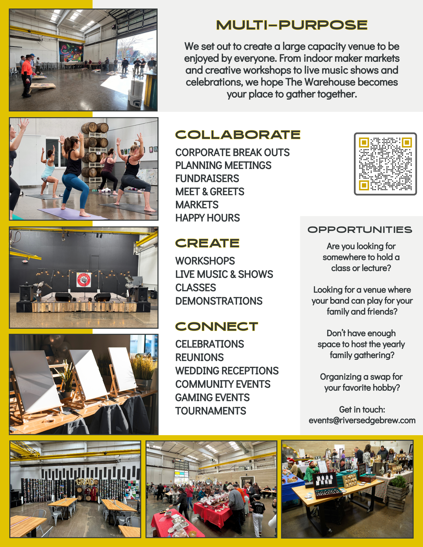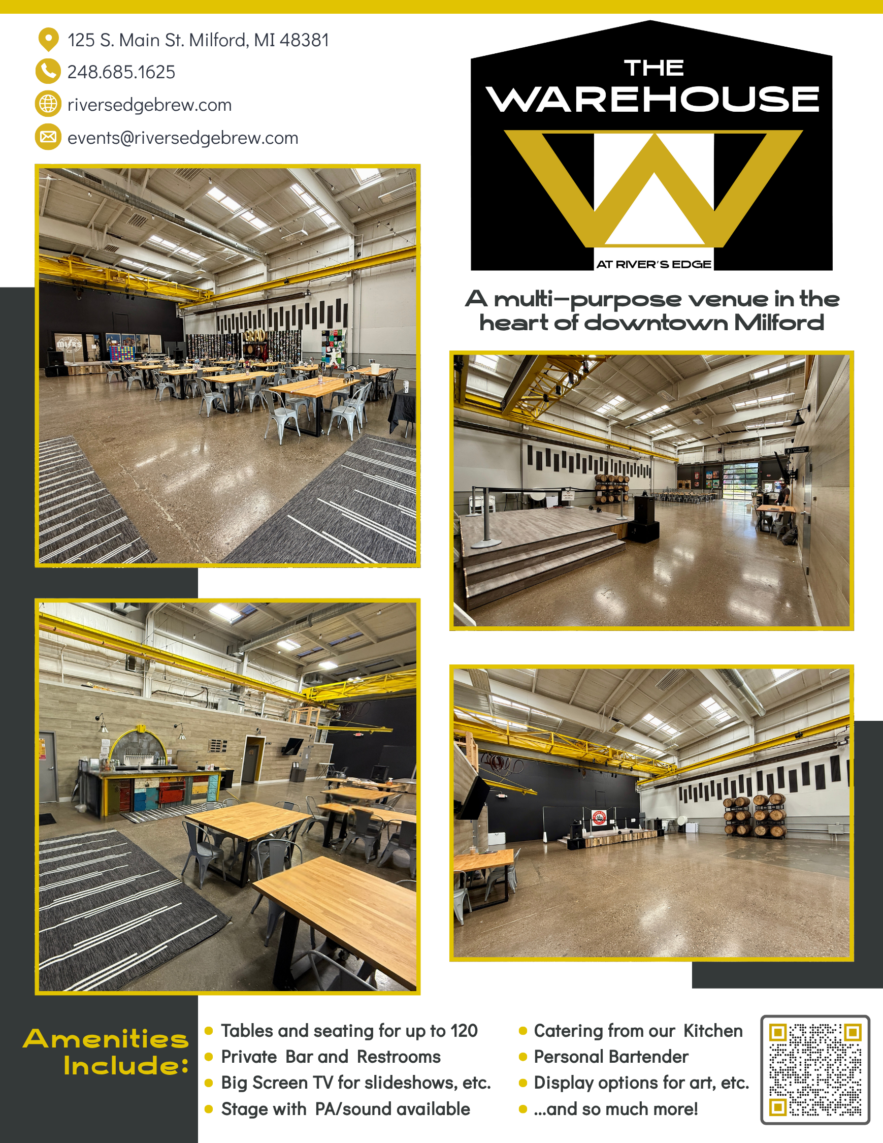We set out to create a destination to be enjoyed by everyone. Flooded with natural light and just steps off Main St., The Warehouse at River’s Edge Brewing Co. provides a larger-capacity venue in the heart of our small down town.